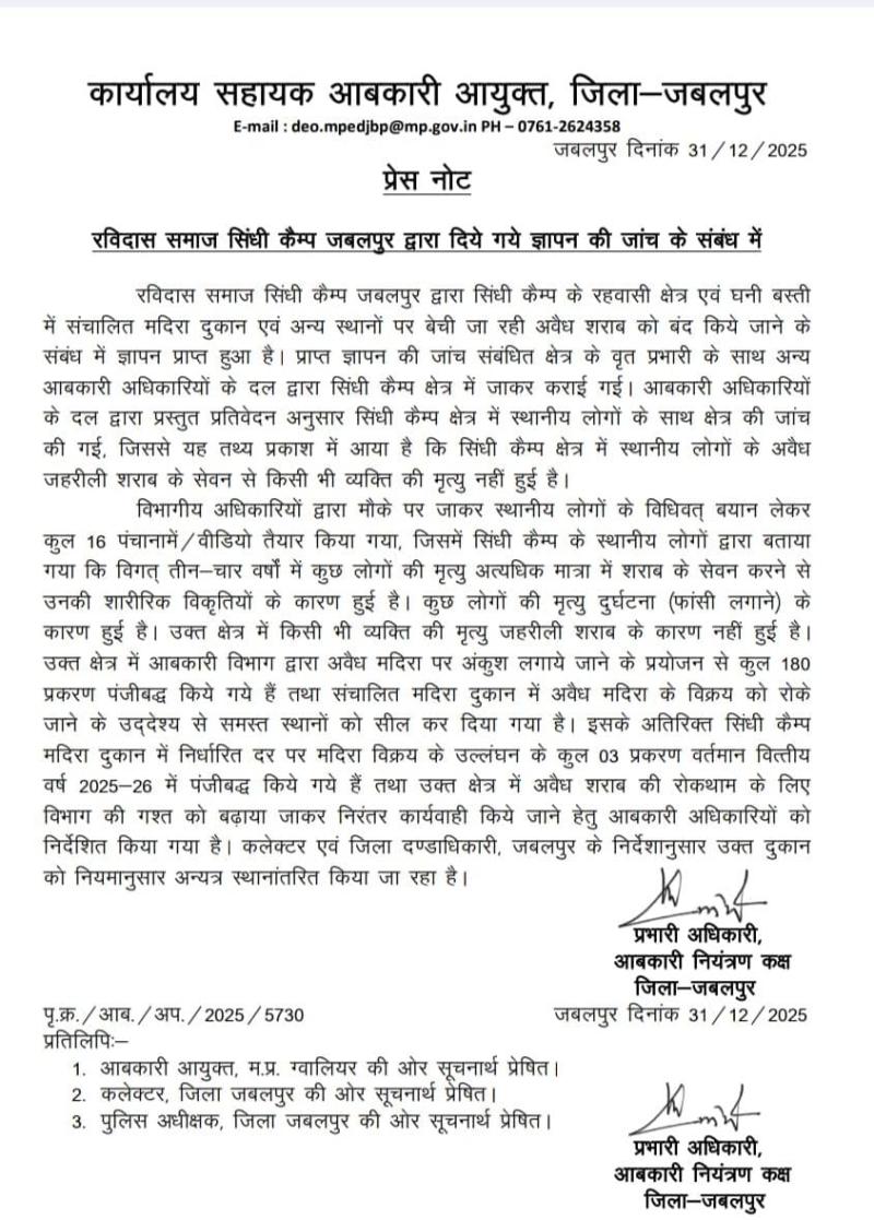 जबलपुर | 31 दिसंबर 2025 सिंधी कैंप क्षेत्र, जबलपुर में अवैध शराब बिक्री और कथित मौतों को लेकर प्राप्त शिकायतों की जांच के बाद आबकारी विभाग ने स्पष्ट किया है कि क्षेत्र में जहरीली शराब के सेवन से किसी भी व्यक्ति की मृत्यु नहीं हुई है। रविदास समाज सिंधी कैंप जबलपुर द्वारा दिए गए ज्ञापन के आधार पर आबकारी विभाग ने संबंधित वृत्त प्रभारी एवं अन्य अधिकारियों के साथ सिंधी कैंप क्षेत्र में जांच की। जांच के दौरान स्थानीय निवासियों से बातचीत की गई और मौके पर स्थिति का जायजा लिया गया।