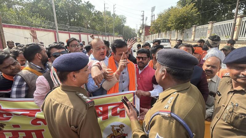 अवैध बूचड़खानों के खिलाफ हिंदू संगठन का निगम घेराव, पुलिस रोकने पर हनुमान चालीसा पाठ