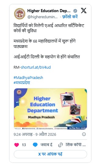 मध्य प्रदेश उच्च शिक्षा विभाग द्वारा महाविद्यालयों में रोजगारोन्मुखी पाठ्यक्रम प्रारंभ करने को लेकर महत्वपूर्ण पहल की जा रही है। इसके तहत शैक्षणिक सत्र 2026-27 से प्रदेश के 68 शासकीय महाविद्यालयों में एआई एवं फिनटेक विथ एआई के ऑनलाइन सर्टिफिकेट कोर्स शुरू होने जा रहे हैं । इनमें 55 प्रधानमंत्री कॉलेज ऑफ एक्सीलेंस तथा 13 स्वायत्त महाविद्यालय शामिल हैं। यह कोर्स आईआईटी दिल्ली के सहयोग से संचालित किया जाएगा।