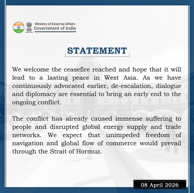 अमेरिका-ईरान सीजफायर पर भारत का बयान: समझौते का किया स्वागत